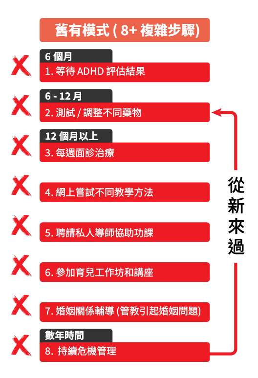 答:傳統方法傾向針對解決症狀,用藥強行控制行為及情緒,並不是從根源解決問題。《60 秒親子關係急救包》包含了我涉獵多年的心理學行為認知元素,鑽研出一套「非入侵性」改善方法,去幫助孩子解決「失去時間觀念」、「情緒失調」、「專注力不足」、「執行力弱」、「感官差異」等大腦結構的核心問題。